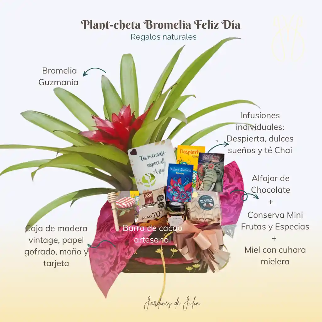 "¿Buscas el regalo perfecto que sorprenda y enamore? Te presentamos Plantchetas, una fusión única de naturaleza y sabores artesanales." 🍫🥮🪷 Plantcheta Feliz Día: Incluye Bromelia Guzmania (color de acuerdo a disponibilidad), porta maceta, barra de cacao con frutas, alfajor, conserva mini individual, 3 infusiones individuales (Despierta, Dulces Sueños y Té Chai), miel con cuchara mielera y ghee, moño y tarjeta con tu mensaje especial. 😍 (Dejar mensaje en la orden). "¡No esperes más! Sorprende con una Plantcheta hoy mismo". Regala vida, regala naturaleza y haz parte del sostenimiento ambiental. 🍫🥮🪷