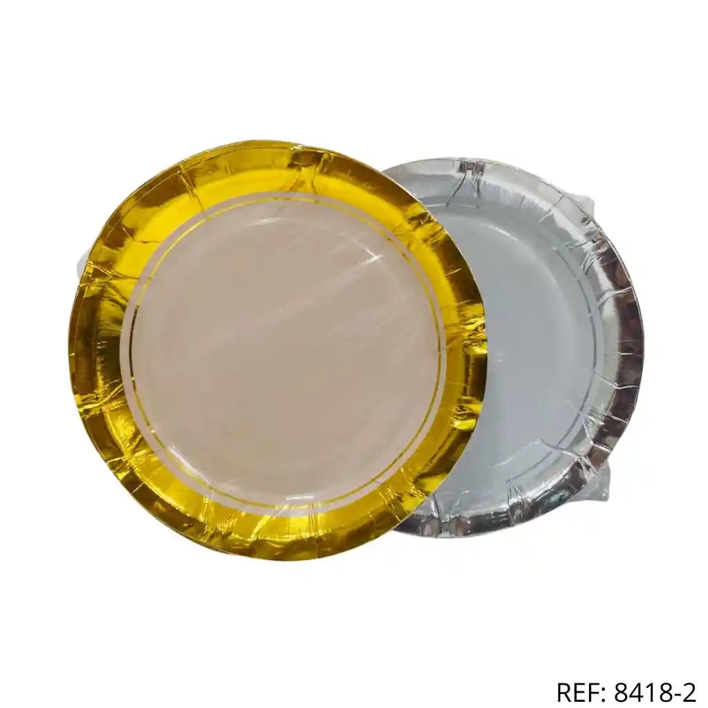 Platos pequeños desechables de polipapel con acabado metalizado en color dorado o plateado. Resistentes a la grasa y la humedad, livianos y prácticos, ideales para fiestas y eventos especiales