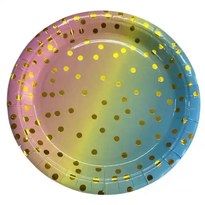 PLATOS EN CARTÓN DECORACIÓN PUNTOS DORADOS PAQUETE X 8 UNDS 23 CMS DIÁMETRO