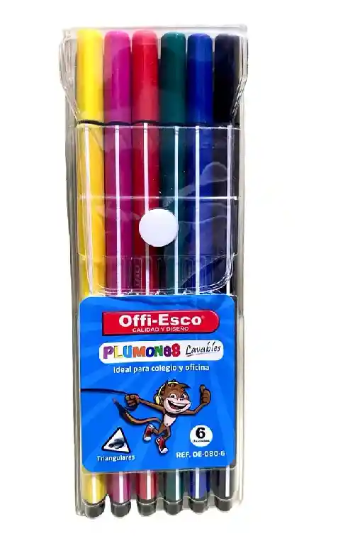 PLUMONES OFFI ESCO LAVABLES X 6 UNIDADES REF OE-080-6. IDEAL PARA OFICINAS, GRAN CONTENIDO DE TINTA, TAPA ANTIASFIXIA, TRIANGULAR, NO TOXICO, IDEAL PARA NIÑOS MAYORES DE 3 AÑOS