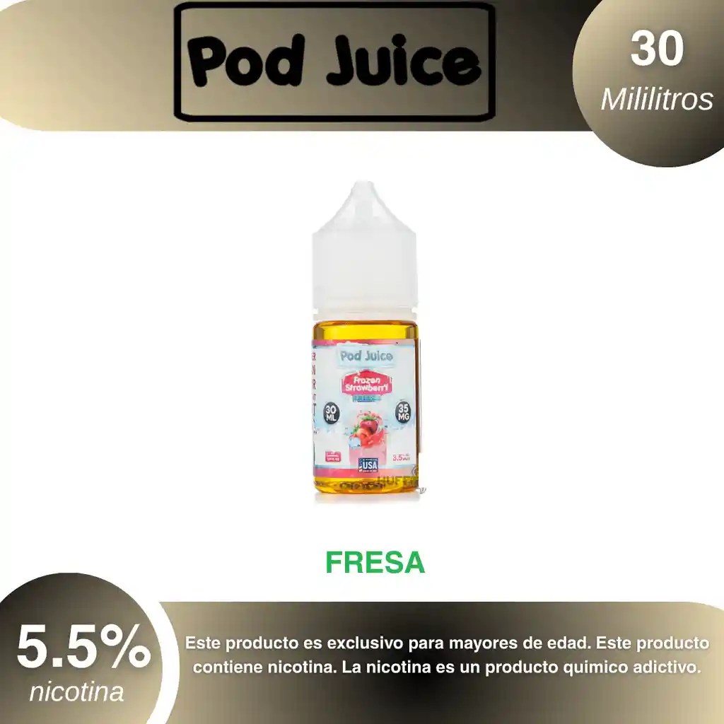 Pod Juice Sales Sabor Fresa 5.5% PROHIBIDA LA VENTA A MENORES DE EDAD. ADVERTENCIA: ESTE PRODUCTO CONTIENE NICOTINA, LA NICOTINA ES UNA SUSTANCIA QUIMICA ADICTIVA Y NOCIVA PARA LA SALUD. Los líquidos para vapeo contienen: propilenglicol USP, glicerina USP, sabor artificial y nicotina. Este producto puede contener nicotina, una sustancia altamente adictiva que puede generar dependencia, posibles afectaciones arteriales, cardiacas, pulmonares y otras aun no identificadas. No se recomienda su uso a mujeres en embarazo, puede generar lesiones al feto. Mantener alejado de niños y mascotas. No ingerir, puede generar irritación y/o intoxicación. Por favor antes de consumir consulte a su médico posibles afectaciones o sensibilidad a alguno de sus componentes. Los componentes de este producto pueden aumentar la sensación de ansiedad En caso de notar alguna reacción adversa por favor suspenda su uso de manera inmediata. Siga las instrucciones en el envase. No alterar sus componentes. Adquiera sus productos en sitios de confianza No use productos piratas, alterados, o en los cuales no pueda comprobar su buena procedencia, Verifique la reputación del fabricante y distribuidor antes de adquirir cualquier producto Si no es usuario fumador o vapeador no se recomienda su uso bajo ninguna circunstancia Al usar este producto usted es consciente que este producto puede generar afectaciones a su salud, incluyendo aquellas que a la fecha de la compra no se han identificado y que pueden aparecer a largo plazo