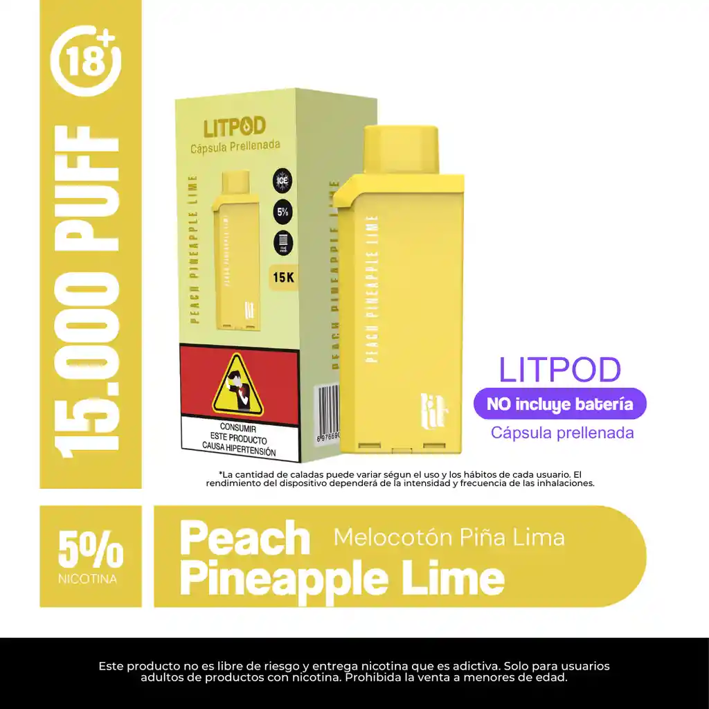 Pod Desechable marca Lit sabor a Peach Pineapple Lime. Fuerza de nicotina: 5%. Sal de nicotina equivalente a aproximadamente 1 paquete de cigarrillos. NO INCLUYE BATERÍA. Prohibida la venta a menores de edad. Producto nocivo para la salud que contiene nicotina, sustancia altamente adictiva. Antes de consumir consulte las indicaciones y contraindicaciones de uso.