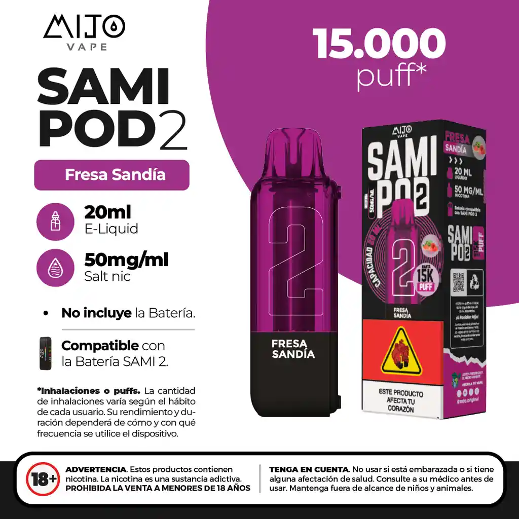 Pod Desechable marca Mijo sabor a Fresa Sandia. Fuerza de nicotina: 5%. Sal de nicotina equivalente a aproximadamente 1 paquete de cigarrillos. NO INCLUYE BATERÍA. Prohibida la venta a menores de edad. Producto nocivo para la salud que contiene nicotina, sustancia altamente adictiva. Antes de consumir consulte las indicaciones y contraindicaciones de uso.