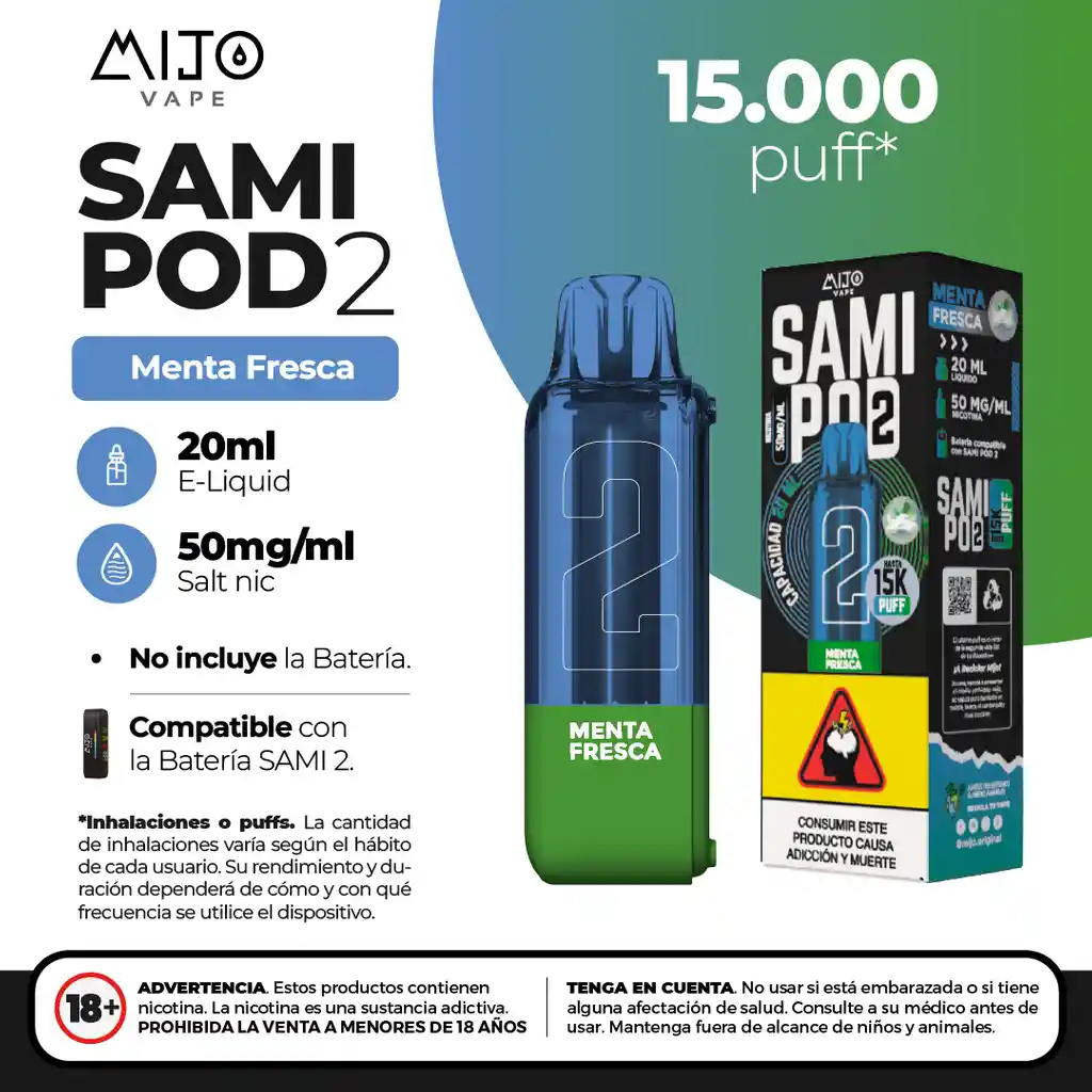 Pod Desechable marca Mijo sabor a Menta Fresca. Fuerza de nicotina: 5%. Sal de nicotina equivalente a aproximadamente 1 paquete de cigarrillos. NO INCLUYE BATERÍA. Prohibida la venta a menores de edad. Producto nocivo para la salud que contiene nicotina, sustancia altamente adictiva. Antes de consumir consulte las indicaciones y contraindicaciones de uso.
