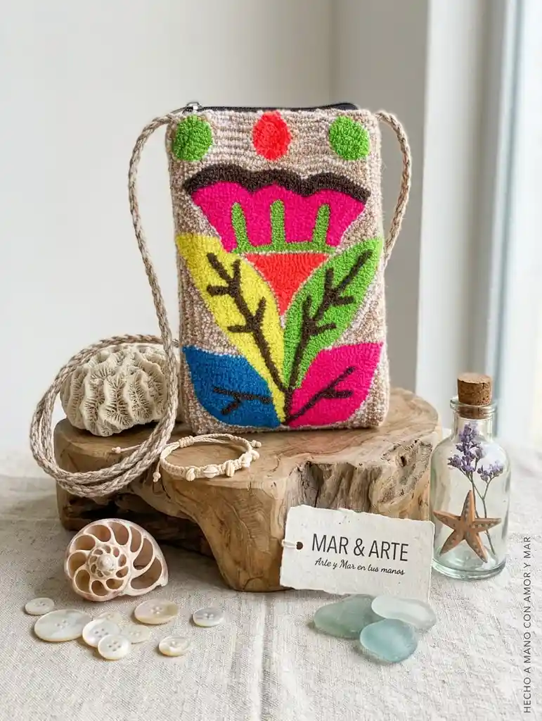 Porta celular Wayuu colores vibrantes diseño de flor. 100% artesanal