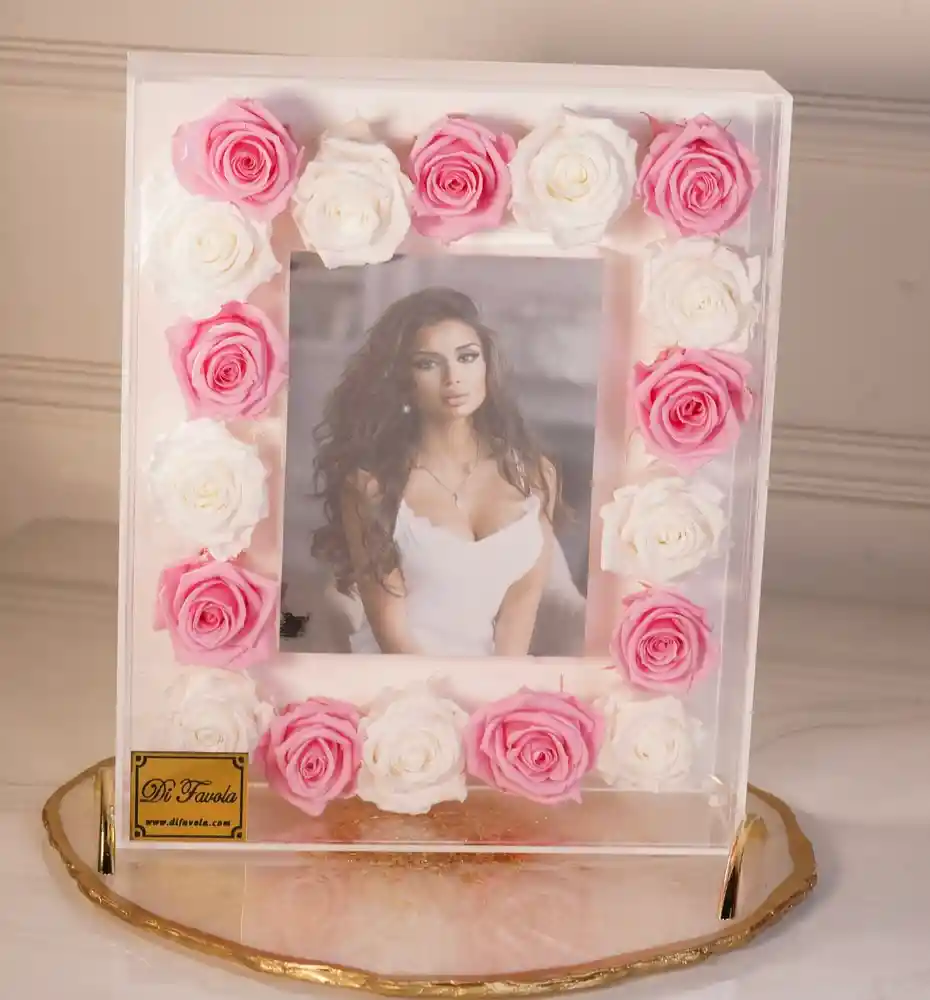 Hermoso porta retratos con cabezas de rosas preservadas tamaño standard en presentación de caja de acrílico espacio para poner fotografia! Incluye tarjeta personalizada Duración rosa: año y medio No necesita agua. Mantenerlas en un lugar fresco y lejos de la luz directa. Perfecto para cualquier ocasión