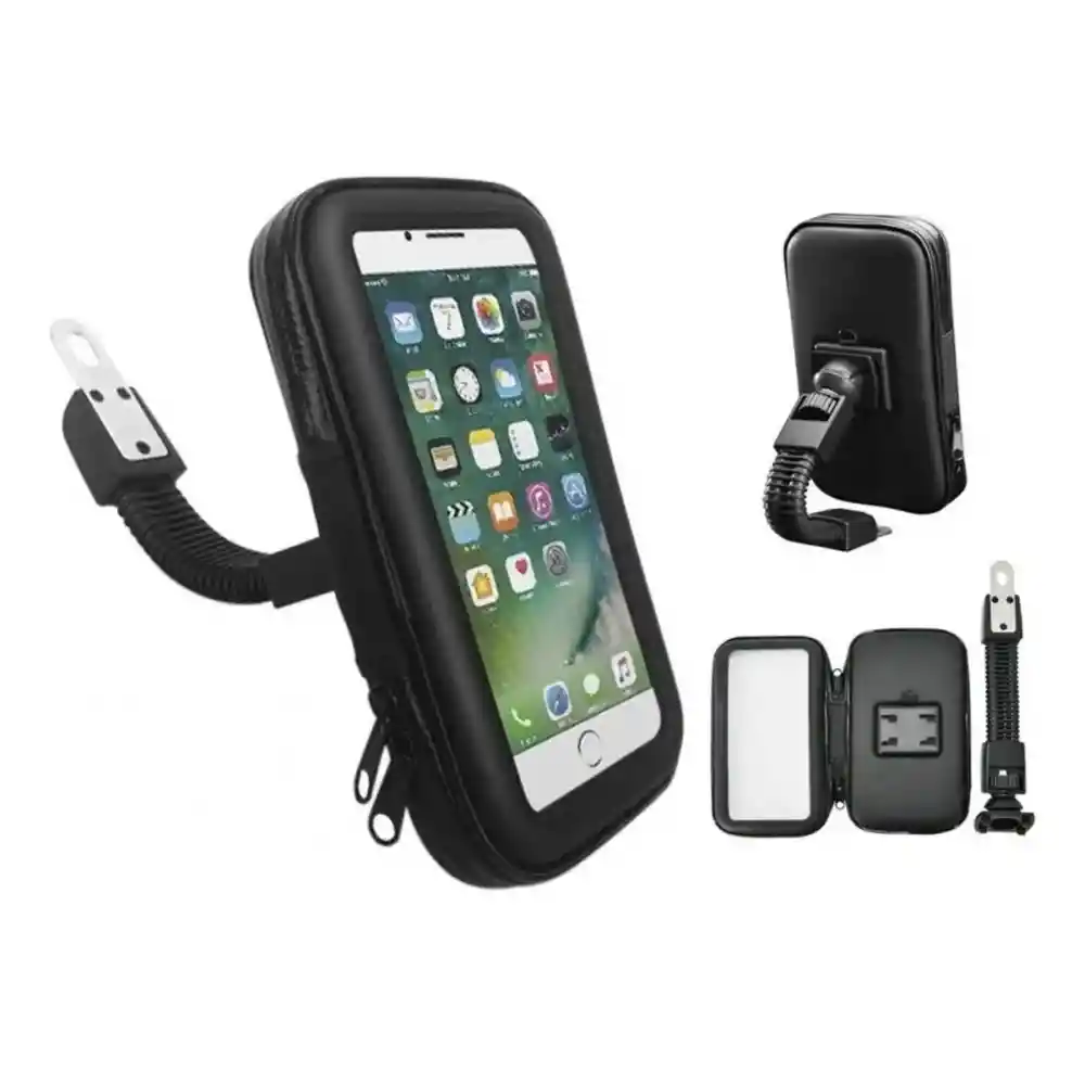 Portacelular para bicicleta y moto, incluye estuche con cremallera impermeable. Apto para dispositivos hasta de 6.5 pulgadas. Dimensiones: Ancho: 11 cm / Largo: 18,5cm / Profundidad: 11cm Color: Negro