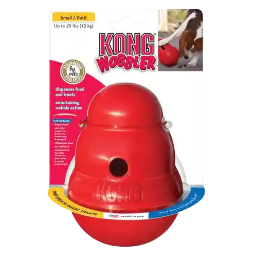 El KONG Wobbler™ es un juguete que llama a la acción y resulta estimulante para la mente del perro porque puede alojar croquetas en su interior. Este juguete con la forma clásica de KONG permanece en posición vertical hasta que el perro lo empuja con las patas o la nariz y, entonces, salen de él deliciosos premios a medida que se tambalea, gira y rueda. El impredecible movimiento estimula instintos naturales y hace que hasta el usuario más experimentado se entretenga. El KONG Wobbler™ también puede utilizarse como una alternativa al tazón para prolongar la hora de la comida y, al mismo tiempo, aumentar el ejercicio de su perro. ¿Quiere que su perro pierda algunos kilos de más? El KONG Wobbler™ es un buen método para que su perro se mantenga activo y se esfuerce por obtener su comida. Se desenrosca para llenarlo y limpiarlo fácilmente. Use el Wobbler™ grande con perros de tamaño.