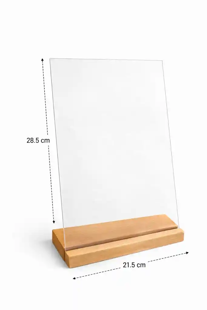 Base Acrílica con Soporte de Madera | 28.5 x 21.5 cm Elegante base acrílica transparente con soporte de madera natural, ideal para exhibir menús, precios, señalización, fotografías, tarjetas informativas, promociones o material gráfico en mostradores, mesas, eventos o negocios. Su diseño minimalista combina perfectamente con cualquier espacio: cocina, cafetería, restaurante, tienda, feria, oficina o evento. Características: Medidas del acrílico: 28.5 x 21.5 cm Acrílico transparente de buen grosor Base de madera sólida y estable Diseño limpio, moderno y funcional Fácil de colocar y retirar impresos Condiciones generales: Se entrega tal como se muestra en las imágenes Venta por viaje Precio final, no negociable