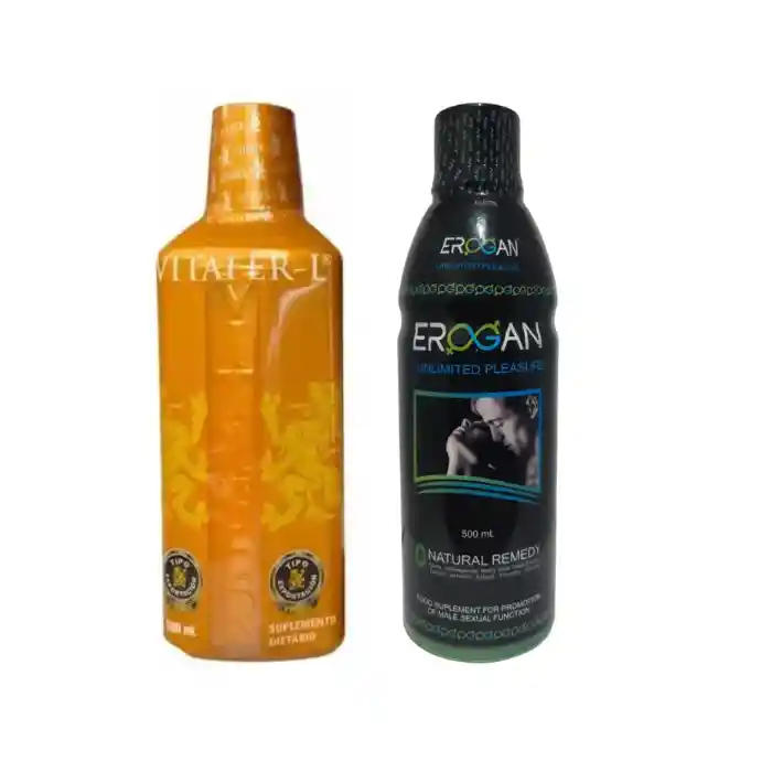Potenciador Y Estimulante Sexual Vitafer-l Jarabe 500 Ml + Potenciador Concentrado- Erogan Jarabe 100% Original Potenciador Y Estimulante Sexual Vitafer-l Jarabe 500 Ml POTENCIADOR Y ESTIMULANTE SEXUAL VITAFER-L JARABE 500 ML El VITAFER es un suplemento alimenticio diseñado para combatir la disfunción y potencializar el deseo sexual. Producto 100% natural. Es un tratamiento progresivo, con efecto duradero que aumenta tu energía. Aumenta la resistencia, la virilidad y los orgasmos Promueve la libido o deseo sexual, alivia el estrés y el cansancio o fatiga, produce energía. Proporciona un estilo de vida sexual saludable, aumenta la resistencia, la virilidad y los orgasmos. Fortalece y aumenta el funcionamiento de tu sistema reproductor con este suplemento alimenticio diseñado para combatir la disfunción y potenciar el deseo sexual. Uso: Dosis por día (1) una cucharada (10 ml) Ingredientes: Sulfato ferroso, 70% sorbitol, propilenglicol, ginseng, sabor a caramelo, vitamina C (ácido ascórbico), vitamina B1 (clorhidrato de tiamina), vitamina B2 (riboflavina), vitamina B6 (piridoxina), vitamina B3 (nicotinamida), ácido. fólico, stevia, metilparabeno de sodio, propil parabeno de sodio, agua purificada. Sabor: No aplica Olor: No aplica POTENCIADOR CONCENTRADO- EROGAN JARABE 100% ORIGINAL Energizante natural. Bebida a base de agua con sabor natural a arándanos Maca, Chontaduro, borojo, L arginina. Erogan Liquido normaliza la función reproductiva en los hombres, reduce la inflamación en la próstata y cambia significativamente la calidad de la vida sexual. Este producto es un salvavidas para la disfunción eréctil y la eyaculación precoz así como permite erecciones más largas y relaciones sexuales mas intensas. La fórmula patentada de Erogan basada en los componentes naturales y afrodisíacos influye en la erección, ayuda a ampliar la sensibilidad sexual y mejora la excitación sexual. Además, la arginina estimula la síntesis de testosterona, que es responsable para la intensidad de la atracción sexual de hombres. La combinación de los componentes únicos aumenta máximamente el torrente sanguíneo al órgano necesario, garantizando el efecto. MODO DE USO: Hay dos formas de ser ingerido 1) copa cada 3 días 2) copa 30 min antes del encuentro sexual. CARACTERÍSTICAS DESTACADAS Contiene: 500 ml potenciador sexual erogan