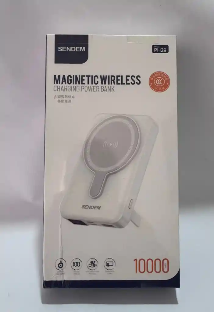 🔋 Power Bank SENDEM Magnética Inalámbrica 10,000 mAh El Power Bank SENDEM magnético inalámbrico de 10,000 mAh es la solución perfecta para cargar tu dispositivo de forma rápida, cómoda y sin cables. Gracias a su sistema magnético, se acopla firmemente a tu smartphone compatible, permitiendo una carga estable incluso mientras lo usas. Su diseño ultracompacto y ligero lo hace ideal para llevar en el bolsillo o bolso, convirtiéndolo en el compañero perfecto para el día a día. Ofrece carga inalámbrica eficiente y también cuenta con puerto de carga por cable para mayor versatilidad. Incorpora protección inteligente contra sobrecalentamiento, sobrecarga y cortocircuitos, garantizando seguridad total durante su uso. ✅ Características principales: Capacidad de 10,000 mAh Carga inalámbrica magnética Compatible con dispositivos con tecnología inalámbrica (MagSafe o Qi) Diseño compacto y portátil Fijación magnética segura Protección inteligente de seguridad Ideal para uso diario y viajes cortos ⚡ Carga fácil, sin cables y con estilo, con SENDEM