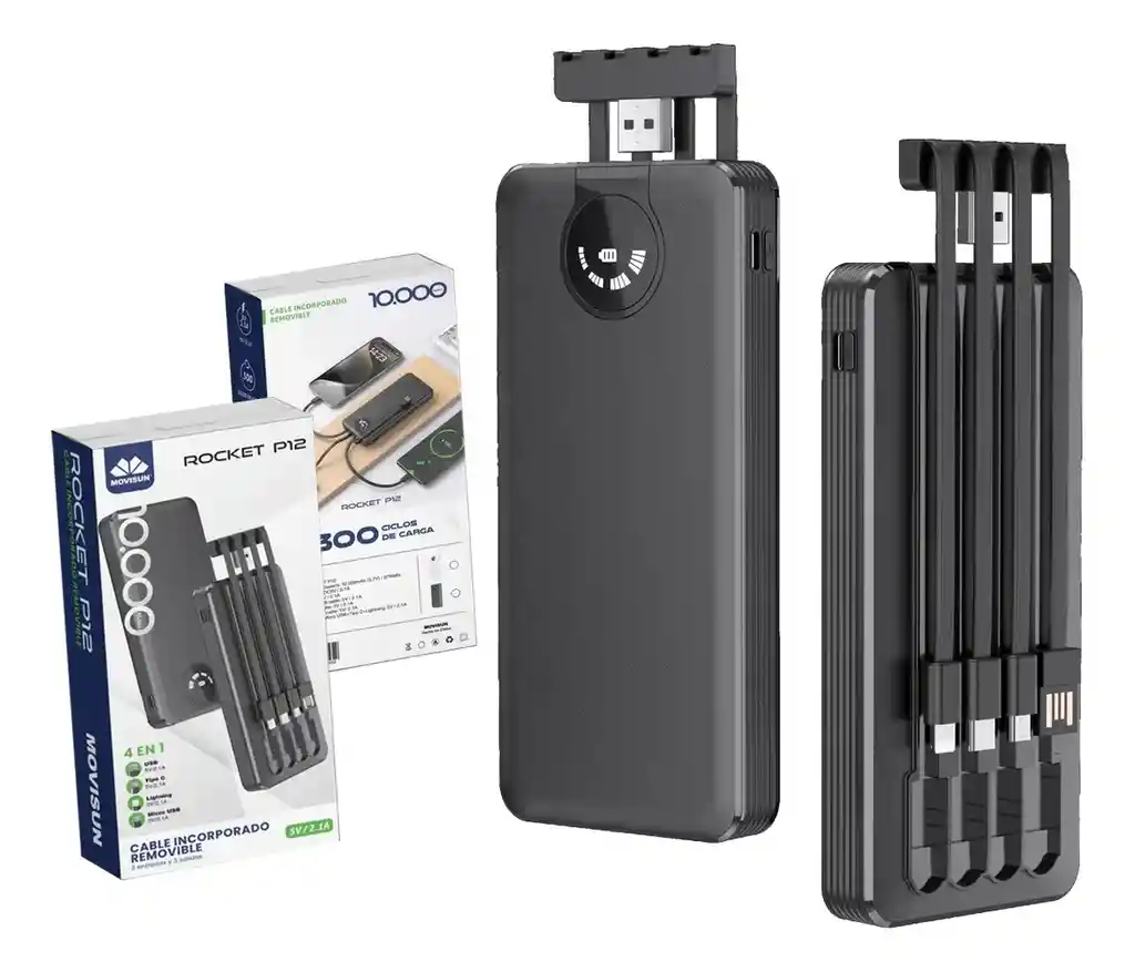 - Modelo: rocket p12 - Capacidad de la batería: 10.000mah (3.7V) / 37watts - Entrado tipo c: DC5V / 2.1A - Salida USB 1: 5V / 2.1A - Salida micro USB cable: 5V / 2.1A - Salida tipo c cable: 5V / 2.1A - Salida lightning cable: 5V / 2.1A - Salidas totales micro USB + tipo c + lightning: 5V / 2.1A - Cable incorporado removible - 2 entradas y 3 salidas
