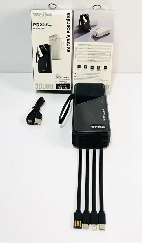 Capacidad: 30000 mAh. Carga Rápida: Tecnología PD 22.5W. Pantalla: Pantalla LED que muestra el porcentaje exacto de batería. Portabilidad: Apta para llevar en el embarque de aviones. Modelo: WB-123. Conectividad: Incluye varios cables integrados para diferentes tipos de dispositivos