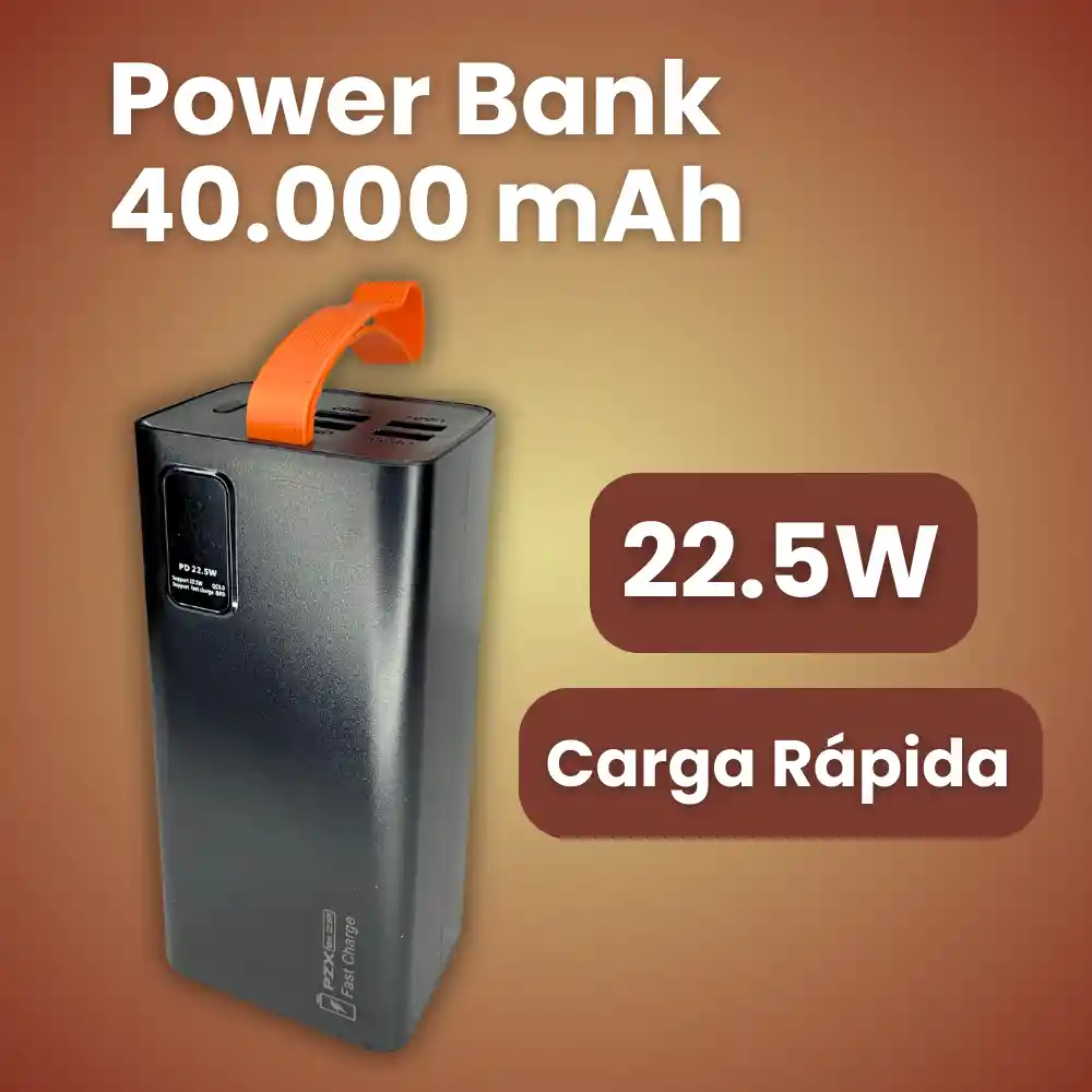 Batería externa de alta capacidad diseñada para usuarios exigentes. El Power Bank PZX V78 de 40.000 mAh ofrece múltiples puertos de salida, compatibilidad con carga rápida PD y QC, pantalla digital de porcentaje y un diseño robusto con asa integrada para fácil transporte. Ideal para cargar varios dispositivos al mismo tiempo durante viajes, trabajo o emergencias. ⚙️ Características principales ✦ Capacidad real indicada de 40.000 mAh ✦ Potencia máxima de salida 22.5W (Super Fast Charging) ✦ Compatible con Power Delivery (PD) y Quick Charge (QC) ✦ Pantalla digital que muestra el porcentaje de batería ✦ 5 salidas totales para carga simultánea ✦ Entrada Micro USB y USB-C ✦ Asa superior integrada para transporte ✦ Carcasa en plástico ABS resistente ✦ Diseño portátil y estable para uso diario o prolongado 📦 Incluye ✦ 1 Power Bank PZX modelo V78 ✦ 1 Cable de carga USB (USB-A a Micro USB) 📐 Especificaciones técnicas ✦ Marca: PZX ✦ Modelo: V78 ✦ Capacidad: 40.000 mAh ✦ Energía nominal: 148 Wh ✦ Potencia máxima: 22.5W ✦ Entradas: Micro USB: 5V/2A – 9V/2A USB-C (IN): 5V/3A – 9V/2A – 12V/1.5A ✦ Salidas: USB-A (negro): 5V/2A máx USB-A (verde QC): 5V/3A – 9V/2A – 12V/1.5A USB-C (OUT): 5V/3A – 9V/2.22A – 12V/1.67A máx ✦ Material: Plástico ABS ✦ Pantalla: Digital (porcentaje de carga) ✦ Certificaciones: CE, FCC, RoHS ⚠️ La velocidad de carga depende del cable y del dispositivo conectado. 💡 Ideal para ✦ Viajes largos y camping ✦ Uso intensivo diario ✦ Cargar varios dispositivos a la vez ✦ Emergencias eléctricas ✦ Trabajo en campo, creadores de contenido o transporte