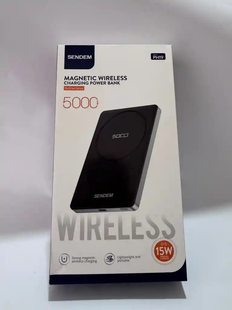 🔋 Power Bank SENDEM Magnética Inalámbrica 5,000 mAh El Power Bank SENDEM magnético inalámbrico de 5,000 mAh es la solución perfecta para cargar tu dispositivo de forma rápida, cómoda y sin cables. Gracias a su sistema magnético, se acopla firmemente a tu smartphone compatible, permitiendo una carga estable incluso mientras lo usas. Su diseño ultracompacto y ligero lo hace ideal para llevar en el bolsillo o bolso, convirtiéndolo en el compañero perfecto para el día a día. Ofrece carga inalámbrica eficiente y también cuenta con puerto de carga por cable para mayor versatilidad. Incorpora protección inteligente contra sobrecalentamiento, sobrecarga y cortocircuitos, garantizando seguridad total durante su uso. ✅ Características principales: Capacidad de 5,000 mAh Carga inalámbrica magnética Compatible con dispositivos con tecnología inalámbrica (MagSafe o Qi) Diseño compacto y portátil Fijación magnética segura Protección inteligente de seguridad Ideal para uso diario y viajes cortos ⚡ Carga fácil, sin cables y con estilo, con SENDEM