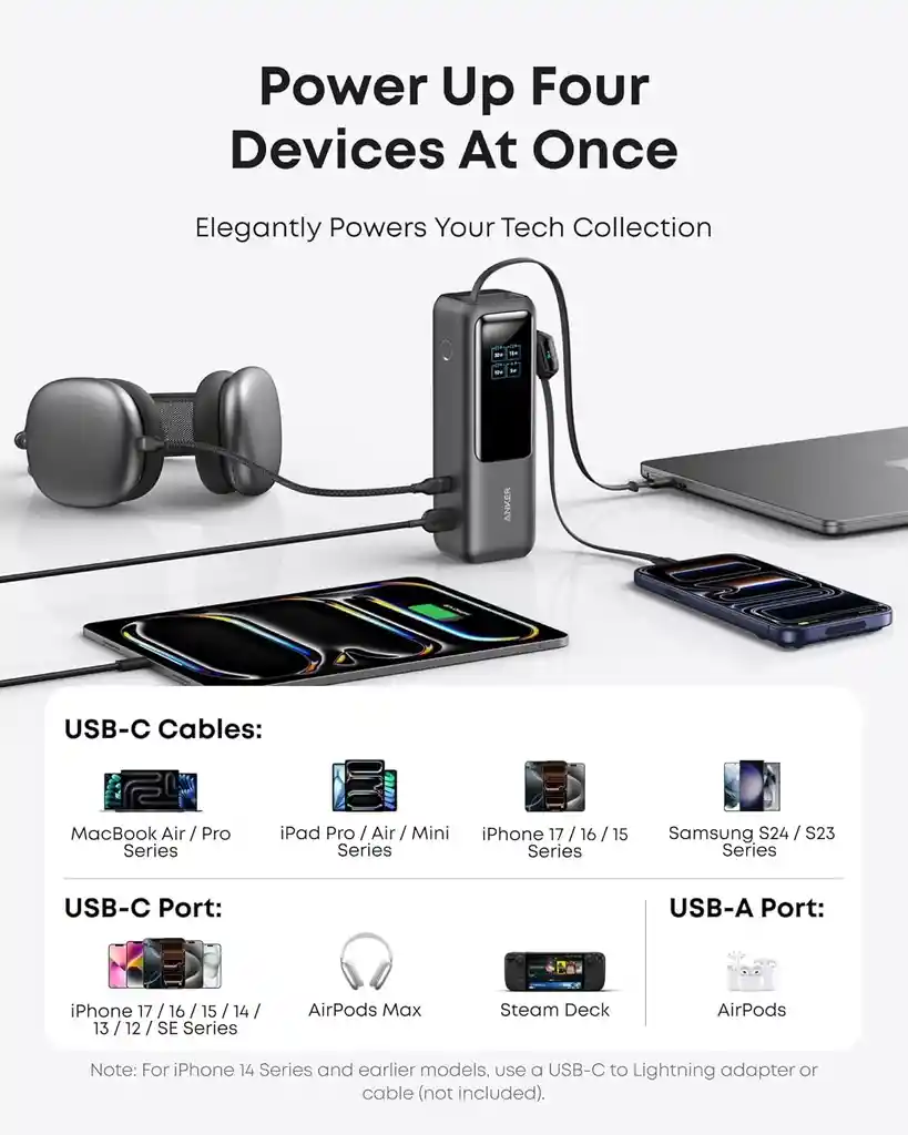 Descubre el Powerbank Batería Inalámbrica de 25000mAh y 165W de Anker, diseñado para quienes buscan una solución de carga eficiente y portátil. Con su capacidad de 25 Ah, este cargador es ideal para mantener tus dispositivos móviles siempre listos, ya sea que uses un iPhone, Samsung, o incluso un MacBook. El modelo A1695H11 cuenta con cuatro puertos de carga, permitiendo que múltiples dispositivos se carguen simultáneamente. Su velocidad de carga super rápida asegura que no pierdas tiempo esperando, mientras que su diseño en color negro le da un toque elegante y moderno. Compatible con una amplia gama de dispositivos, desde AirPods hasta drones DJI, este cargador es perfecto para profesionales y entusiastas de la tecnología. Además, su protección contra sobrecarga garantiza un uso seguro y confiable en todo momento. Con un voltaje de entrada de 110V/220V y un voltaje de salida de hasta 165W, este powerbank es una herramienta esencial para quienes están en constante movimiento. Lleva contigo la tranquilidad de saber que tus dispositivos estarán siempre cargados y listos para usar.