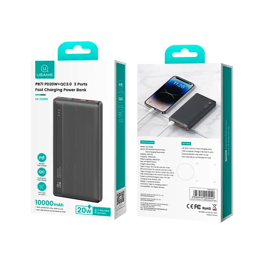 Power Bank 10,000mAh de 2 puertos de diseño compacto y ligero. Carga dos dispositivos simultáneamente con las salidas USB-A (5V-2A cada una) y recárgalo rápidamente a través de los puertos Tipo-C y Micro (5V-2A). Con un banco de energía de 10,000mAh. La pantalla de energía en tiempo real y la textura antideslizante ofrecen conveniencia y comodidad. Incluye cable de carga Tipo-C para una experiencia completa. Potencia y estilo, siempre contigo. Dos salidas USB, carga 2 dispositivos simultáneamente Entradas Micro USB + Tipo C, para mayor comodidad Chip de batería de polímero de litio de alta calidad para protección múltiple, carga segura. Monitor inteligente y control de la temperatura del circuito para una carga segura Si no hay ninguna operación dentro de 30s en modo de espera, el indicador de encendido se apaga automáticamente y entra en modo de ahorro de energía Cumple con las normas internacionales de seguridad del transporte aéreo de la UN38.3, se puede llevar en el tren de alta velocidad de la aeronave. Especificaciones: Modelo: US-CD205 Material: ABS+PC Capacidad: 10000 Mah Capacidad nominal: 6000 Mah Tamaño: 147*68.6*17.5 mm Peso: Alrededor de 228 g