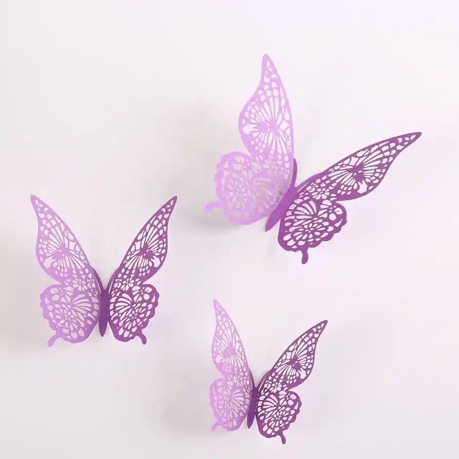 PQTE MARIPOSAS X 12 UNID MORADO SURTIDA EN 3 TAMAÑOS GRANDE MEDIANA Y PEQUEÑA, CONTIENE CINTA DOBLE FAZ PARA PEGARLAS, CON LAS ALAS DESPLEGABLES