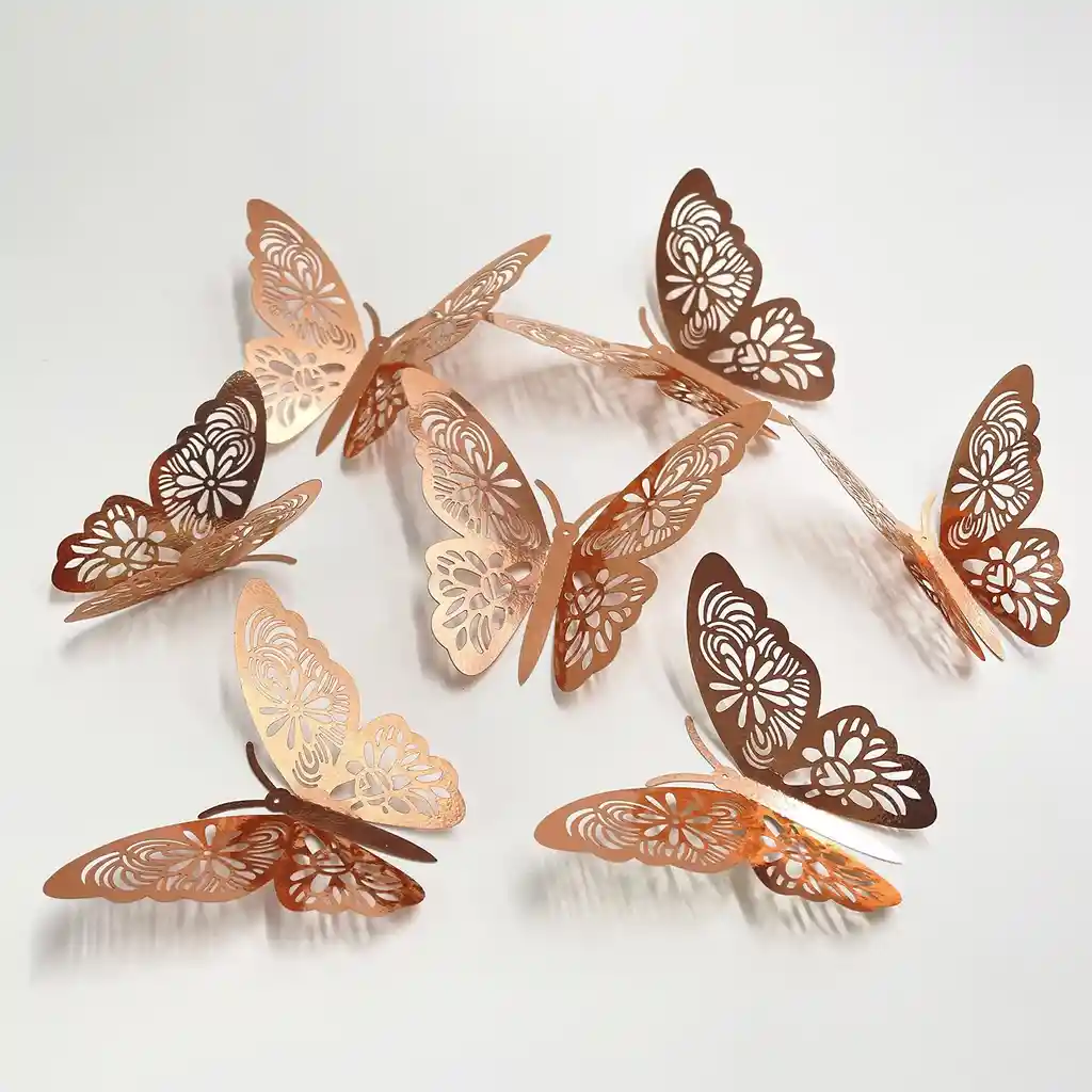 PQTE MARIPOSAS X 12 UNID ORO ROSA SURTIDA EN 3 TAMAÑOS GRANDE MEDIANA Y PEQUEÑA, CONTIENE CINTA DOBLE FAZ PARA PEGARLAS, CON LAS ALAS DESPLEGABLES