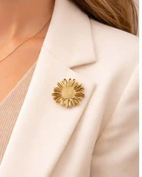 Prendedor girasol con acabado brillante, diseño elegante y garantía de 3 meses.