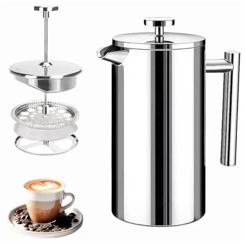 Prensa Francesa de Acero Inoxidable 1000ML – Café Gourmet con Sabor Intenso La Prensa Francesa de 1000 ml es una opción práctica para preparar café, té e infusiones con un sabor más natural y aromático. Su sistema de filtrado por presión permite extraer mejor los aceites y esencias del café molido, logrando una bebida con cuerpo y textura equilibrada. Es ideal para el hogar u oficina y para quienes disfrutan preparar café de forma artesanal. Su estructura en acero inoxidable ofrece buena resistencia al uso diario y ayuda a conservar la temperatura de la bebida por más tiempo. El filtro de malla fina reduce residuos en la taza y facilita una preparación limpia. Características Principales • Preparación manual que resalta el sabor y aroma del café • Sistema de filtrado por presión con malla fina • Conserva mejor el calor gracias a su cuerpo metálico • No requiere electricidad • Uso sencillo y práctico • Ideal para café, té e infusiones • Estructura resistente para uso diario • Limpieza fácil con piezas desmontables Especificaciones Técnicas Capacidad: 1000 ml Material: Acero inoxidable 304 grado alimenticio Sistema de filtrado: Malla fina de alta densidad Construcción: Doble pared metálica Mango: Ergonómico con aislamiento térmico Boquilla: Vertido controlado anti goteo Uso eléctrico: No requiere Limpieza: Manual o lavavajillas Preparaciones Sugeridas • Café molido artesanal • Té de hojas sueltas • Aromáticas e infusiones naturales • Bebidas calientes con hierbas Contenido del Paquete • 1 Prensa francesa de acero inoxidable 1000 ml • Sistema de filtro integrado • Manual básico de uso Garantía Este producto cuenta con 30 días de garantía por defectos de fabricación. Política de Retracto Aplica el derecho de retracto dentro de los 5 días hábiles posteriores a la entrega. El producto debe devolverse sin uso, en perfecto estado y con su empaque original intacto. Notas Importantes • Para aplicar garantía o retracto se deben enviar fotos y/o videos que evidencien el estado del producto • La garantía no cubre daños por golpes, caídas, mal uso o manipulación indebida • Lavar antes del primer uso para mantener la pureza del sabor