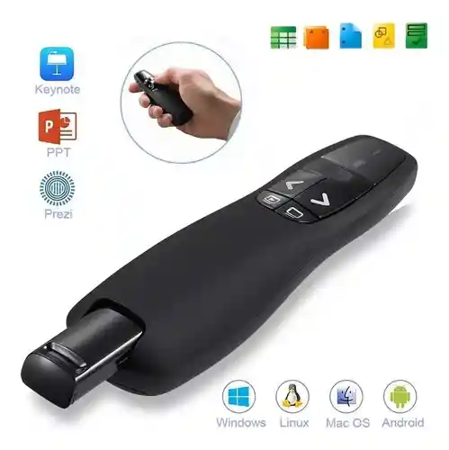 El presentador inalámbrico está diseñado para ayudarlo a expresar su punto en una reunión. Tiene un puntero rojo, es fácil de ver contra la mayoría de fondos y superficies de proyección, puede estar seguro de que no perderá el punto. Sus controles intuitivos de presentación de diapositivas le ayudan a navegar a través de su presentación con confianza. El puntero rojo con indicador LED es fácil de ver en la mayoría de los fondos y superficies de proyección. Indicador de batería, te hace entender la situación de la energía. Interruptor On off, puede extender la vida útil de la batería. Modo de presentador: Teclas táctiles intuitivas para controlar fácilmente la presentación de diapositivas, se requieren baterías AA. Puntero brillante: Fácil de ver contra la mayoría de los fondos. Hasta 30 metros de distancia: Alcance inalámbrico de 30 metros de distancia para libertad de movimiento por la habitación. Tecnología inalámbrica RF de 2.4 GHz: La bahía de acoplamiento integrada almacena el receptor para facilitar el embalaje y la portabilidad. No requiere instalar software: Simplemente conecte el receptor a un puerto USB para comenzar. Y cuando termine el programa, puede almacenar el receptor en el presentador, Especificaciones: Material: plástico Color: negro Alcance efectivo: aprox. 30m Batería: 2 pilas AAA (No incluido) Tecnología inalámbrica de 2,4 GHz. Puerto USB Potencia de salida 1mW Requisitos del sistema: Windows XP, Windows Vista o Windows 7/8/10 Tamaño: aprox. 11,5x3,7x2,7 cm Peso neto: 36G