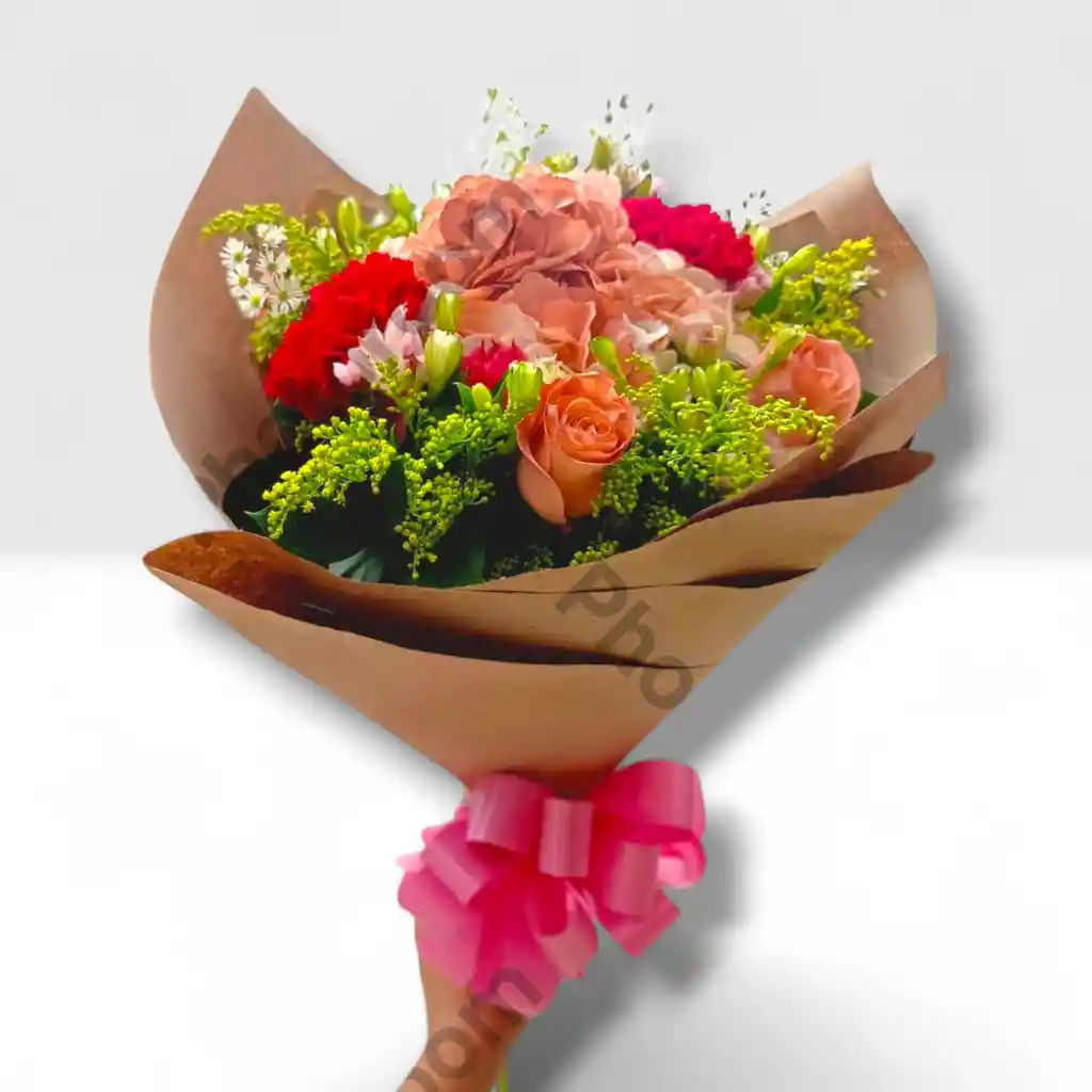 1 HORTENSIA CON CLAVELES, ROSAS Y ASTROMELIAS, ADORNADA CON FOLLAJE VERDE, AMARILLO Y BLANCO ENVUELTO EN PAPEL COREANO ( COLOR DE PAPEL SEGUN DISPONIBILIDAD) Y MOÑO