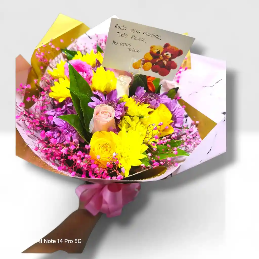 RAMO VARIEDAD DE MARGARITAS O POMPONES DE COLORES Y 3 UNIDADES DE ROSAS, ENVUELTO EN PAPEL COREANO( COLOR DE PAPEL SEGUN DISPONIBILIDAD) Y MOÑO