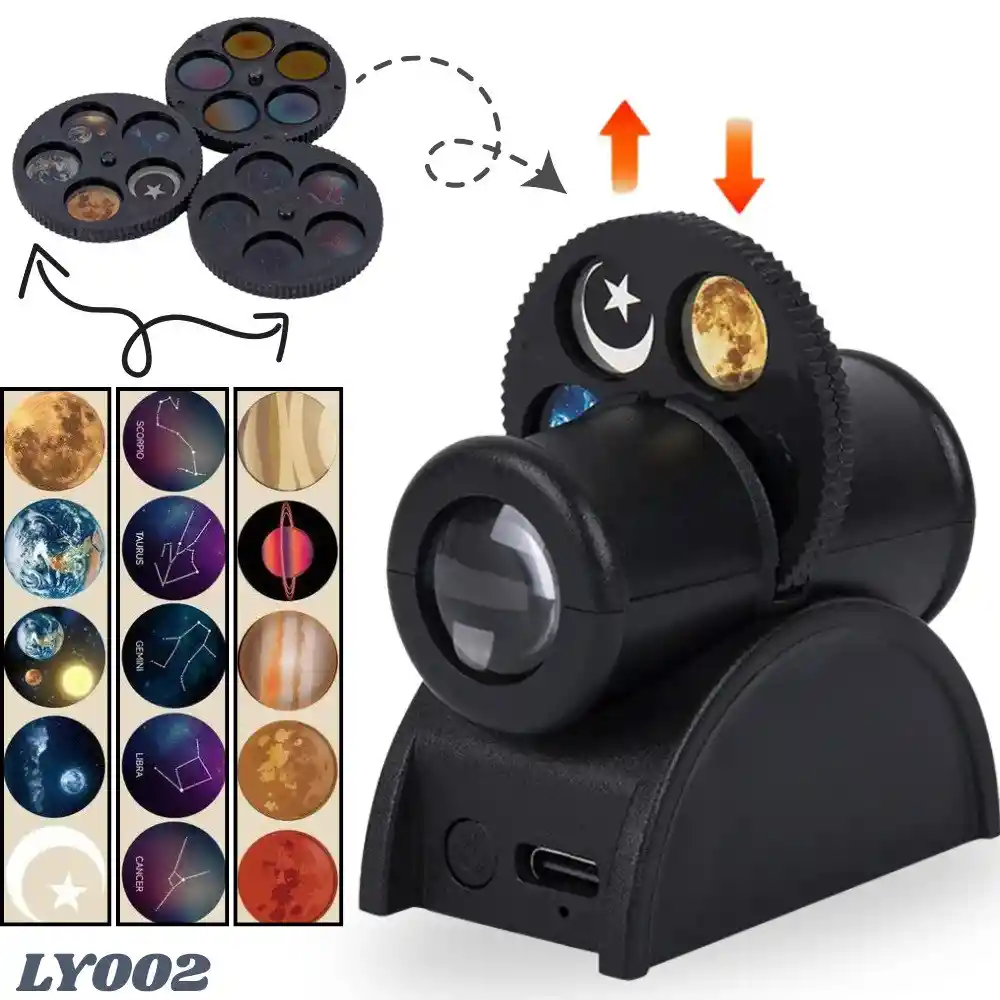 Proyector De Pared Lámpara de Proyección Atmosférica Luna Planetas Constelaciones Recargable. Transforma tu techo o pared en una ventana al universo. Olvídate de las habitaciones aburridas. Con este Mini Proyector Galáctico, puedes viajar al espacio sin salir de tu cama. Utiliza un sistema de lentes y diapositivas para proyectar imágenes nítidas y realistas de cuerpos celestes, creando una atmósfera mágica al instante. Es perfecto para relajarse antes de dormir, crear un fondo único para tus fotos y videos, o como una luz de acompañamiento espectacular para los amantes de la astronomía. Características: - Sistema de Diapositivas Intercambiables (3 en 1): Como se muestra en la imagen, el proyector cuenta con una rueda giratoria integrada que contiene diferentes "lentes" o diapositivas. Con un simple giro, puedes cambiar la proyección entre: * Tierra / Luna Llena Realista: Con detalles impresionantes de sus cráteres. * Planetas: Una vista espectacular de nuestros planetas desde el espacio. * Constelaciones y Nebulosas: Un campo estelar profundo para perderse mirando. - Ángulo de Proyección Ajustable: Gracias a su base de soporte inclinable, puedes dirigir el haz de luz exactamente donde lo necesitas. - Portátil y Recargable: Cuenta con una batería interna recargable vía puerto USB (cable incluido). Su tamaño ultra compacto te permite llevar la magia a cualquier habitación, a una pijamada o incluso de camping. Especificaciones: - Material: Plástico ABS resistente. - Fuente de luz: LED de alta eficiencia. - Modo de funcionamiento: Rueda de selección manual de imagen y botón de encendido/apagado. - Carga: Puerto USB (Tipo-C). - Distancia de proyección óptima: Entre 1.5 y 3 metros (cuanto más lejos, más grande la imagen, aunque puede perder un poco de nitidez en los bordes extremos). ¿Qué incluye la caja? 1 * Mini Proyector Galáctico. 3 * Rueda de diapositivas integrada. 1 * Cable de carga USB. 1 * Manual de usuario.