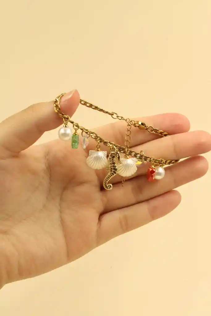 Pulsera en acero inoxidable con dijes marinos y ajuste graduable, perfecta para un look delicado y lleno de estilo.