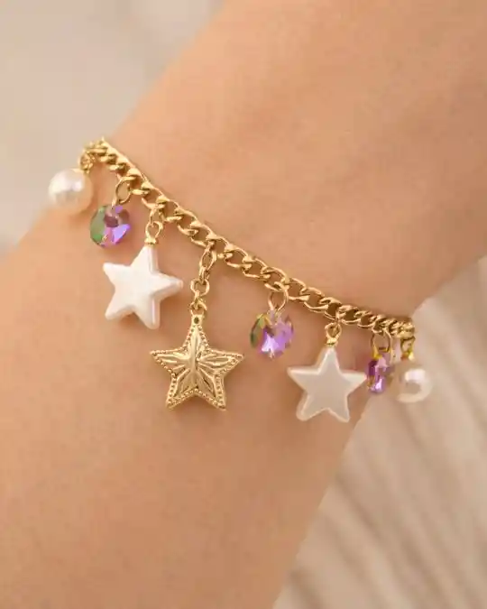 Pulsera en acero inoxidable ajustable con dijes de estrellas y perlas, resistente, elegante y con garantía de 3 meses por el color.