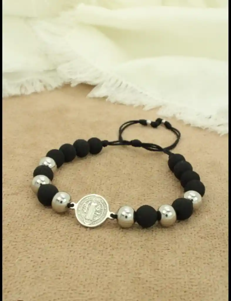 Pulsera en acero Plateado de San Benito, con cuerdas negras y medalla central. Diseño elegante y ajustable, resistente al agua, no se oxida ni pierde color. Ideal para protección, uso diario o regalo especial.