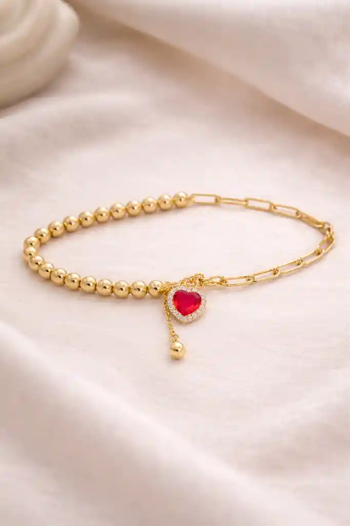 Pulsera mitad en bolitas , mitad con un diseño especial en la mitad un dije de corazon color rojo ,material cover gold