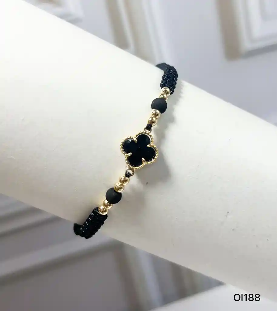Pulsera tejida en hilo terlenca con 8 balines de 3mm y neopreno de 5 mm dije de trebol de 15mm en oro laminado 18K. La Pulsera es ajustable hasta 24 cm de diámetro. Va empacada en Cajita para Obsequio. QUE ES EL ORO LAMINADO? Son piezas que se obtienen fundiendo TRES láminas gruesas de ORO de 18K, sobre una base especial de 2 metales: Tombac y Paladio; esta última asegura la adherencia, que junto a las láminas de ORO de 18K, forman un material antialérgico (libre de níquel), de alta resistencia garantizando la invariabilidad de su color en el tiempo y con el mismo tono, textura y brillo del ORO 18K. Todas nuestras joyas en oro laminado 18k tienen 1 años de garantía. -CUIDADOS ESPECIALES - Si la usas para hacer ejercicio, en la piscina o en el mar, simplemente debes lavarla con agua y jabón, y frotar suavemente con un cepillo de dientes de cerdas suaves; para que todos estos agentes corrosivos no afecten su brillo y la semi joya pueda perdurar en el tiempo. NO aplicar ácidos y evitar rayones o raspaduras. ATENCIÓN: LA JOYA NO ES EMPEÑABLE, NO ES ORO MACIZO- ASÍ QUE NO SE VENDE POR PESO NI GRAMOS. Somos giftsjoyas