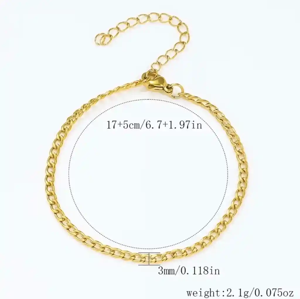 PULSERA CADENA NORMAL DORADA DE ACERO INOXIDABLE CON COBERTURA DE CHAPA DE ORO DE 18K CON PICOLORO Y CADENA DE EXTENSION DE ACERO. TAMAÑO: 17,5 CM ESTANDAR Podrás añadir el mini dije que deseas por un valor adicional que dependerá de cada dije, los cuales se venden por separado, de esta manera podrás armar una hermosa pulsera a tu gusto. Reinventate y arma tu pulsera para fechas especiales, regalos y mas. PASOS: 1. SELECCIONA LA PULSERA BASE EN EL CARRITO Y LA CANTIDAD 2. ESCRIBIR EN EL BUSCADOR LA PALABRA "MINI" O "MINIDIJE" 3. SELECCIONA EL MINIDIJE QUE MAS TE GUSTE Y AGREGALO AL CARRITO 4. DEJA UN COMENTARIO AL SHOPPER QUE DESEAS AGREGAR EL MINIDIJE A LA PULSERA Y COMO LO DESEAS.