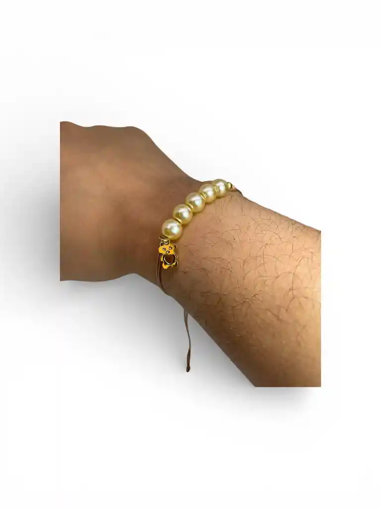 Las perlas originales son gemas orgánicas que se forman dentro de ciertos moluscos, y se asocian con la elegancia, la pureza y la sofisticación. Las perlas acrílicas son esferas sintéticas ligeras, opacas, son mas ligeras, de superficie lisa y colores hermosos sin embargo la apariencia única de este diseño no opaca su significado y elegancia. y su color blanco perlado no solo pureza si no que ademas refleja sabiduria. Composición: -Hilo coreano celular camel 0,8mm -Perlas acrilicas x4 -Dije acero oso tous -Balin #4 golfi x 2 -Tamaño: 16 - 18cm