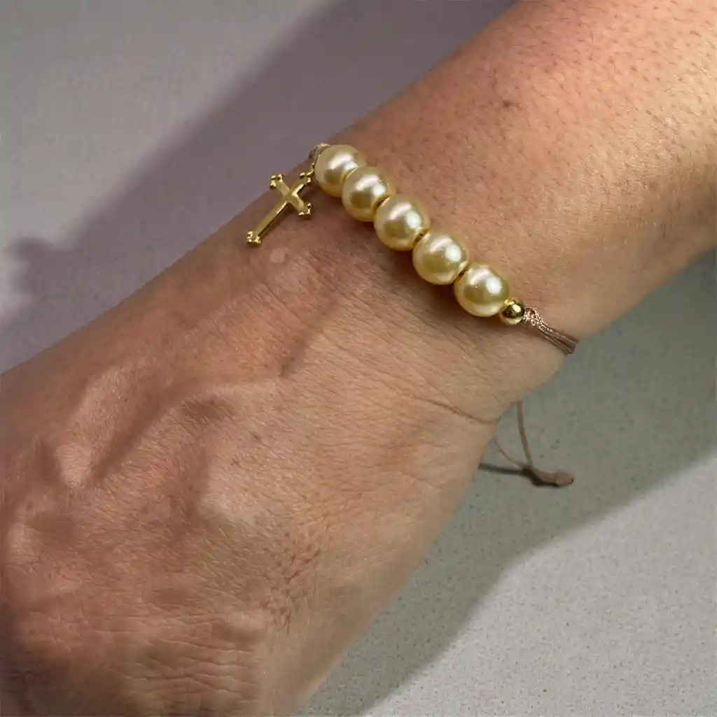 Las perlas originales son gemas orgánicas que se forman dentro de ciertos moluscos, y se asocian con la elegancia, la pureza y la sofisticación. Las perlas acrílicas son esferas sintéticas ligeras, opacas, son mas ligeras, de superficie lisa y colores hermosos sin embargo la apariencia única de este diseño no opaca su significado y elegancia. y su color blanco perlado no solo pureza si no que ademas refleja sabiduria. Composición: -Hilo coreano celular camel 0,8mm -Perlas acrilicas x4 -Dije acero oso tous -Balin #4 golfi x 2 -Tamaño: 16 - 18cm