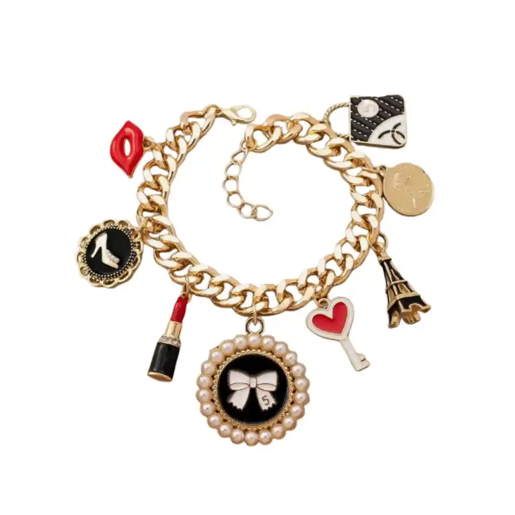 Eleva tu estilo con esta hermosa pulsera dorada tipo charm, diseñada para mujeres que aman los accesorios con personalidad. Su cadena en acabado dorado brillante incluye dijes inspirados en moda, glamour y amor, creando una pieza única y muy chic. ✨ Detalles del diseño: Dijes en relieve con figuras de: labial, tacón, beso rojo, llave con corazón, Torre Eiffel, moneda, bolso fashion y medallón con perlas. Acabado dorado de alta calidad, resistente y perfecto para uso diario. Estilo moderno y femenino que combina con cualquier outfit. Cierre ajustable para mayor comodidad. Ideal para: ✔ Regalos especiales ✔ Looks elegantes y casuales ✔ Complementar outfits de noche o día ✔ Mujeres que aman la moda y los accesorios chic Esta pulsera es el detalle perfecto para brillar con estilo único. 🌟