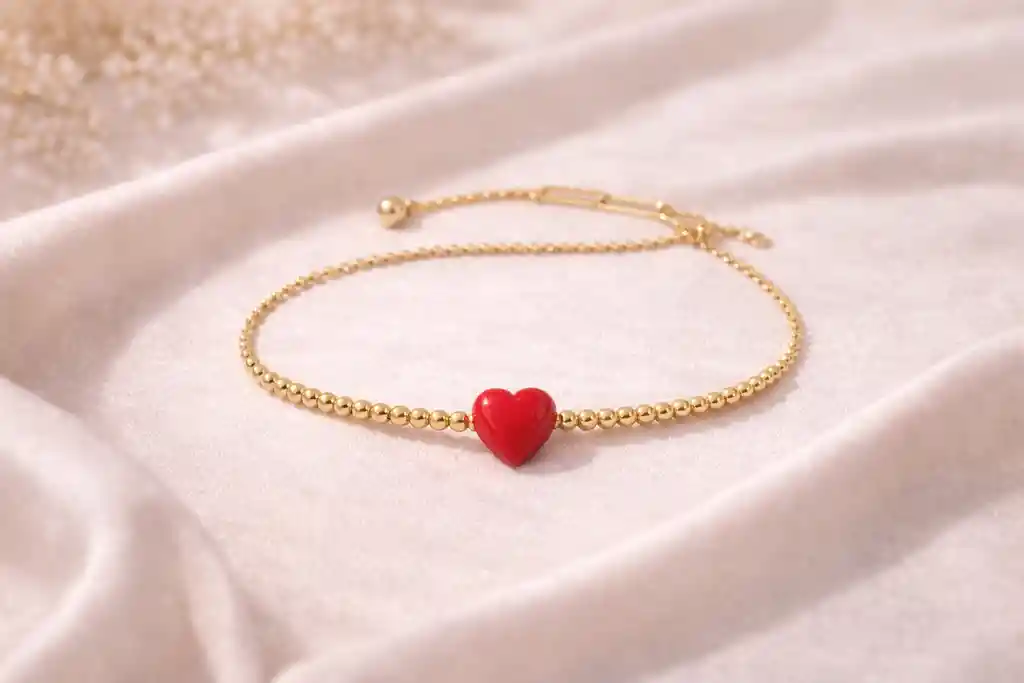 Pulsera con dije de corazon rojo , la pulsera tiene unas bolitas doradas , material cover gold