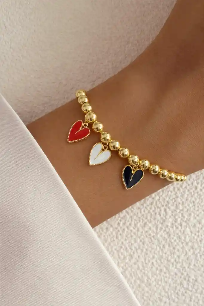Pulsera en bolitas , color dorada con 3 dijes de corazon color Blanco , rojo y negro, Material Cover gold