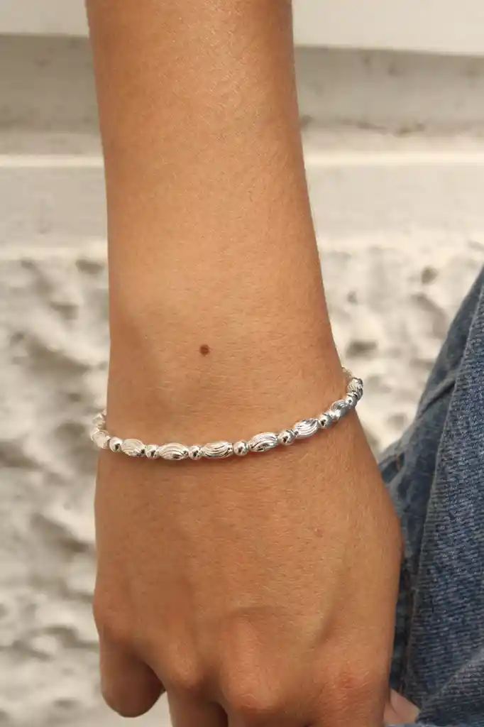 Tobillera plateada en rodio blanco, con balines grabados, fresca y moderna, perfecta para darle un toque juvenil y cool a tu look. ✨