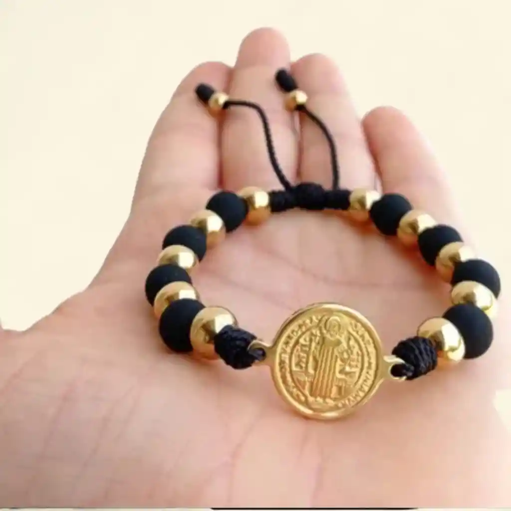 Pulsera en acero dorado de San Benito, con cuentas negras y medalla central. Diseño elegante y ajustable, resistente al agua, no se oxida ni pierde color. Ideal para protección, uso diario o regalo especial.