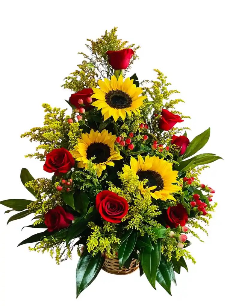 Hermosa canasta floral compuesta por girasoles y rosas frescas, acompañadas de soliaster y abundante follaje verde. Un diseño alegre y elegante que combina calidez y romanticismo, ideal para sorprender en cumpleaños, aniversarios o momentos especiales.