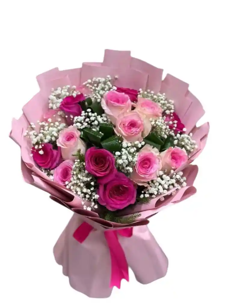 Hermoso ramillete de rosas colores combinados con follaje verde y gisofilias Envoltura en papel coreano y lazo