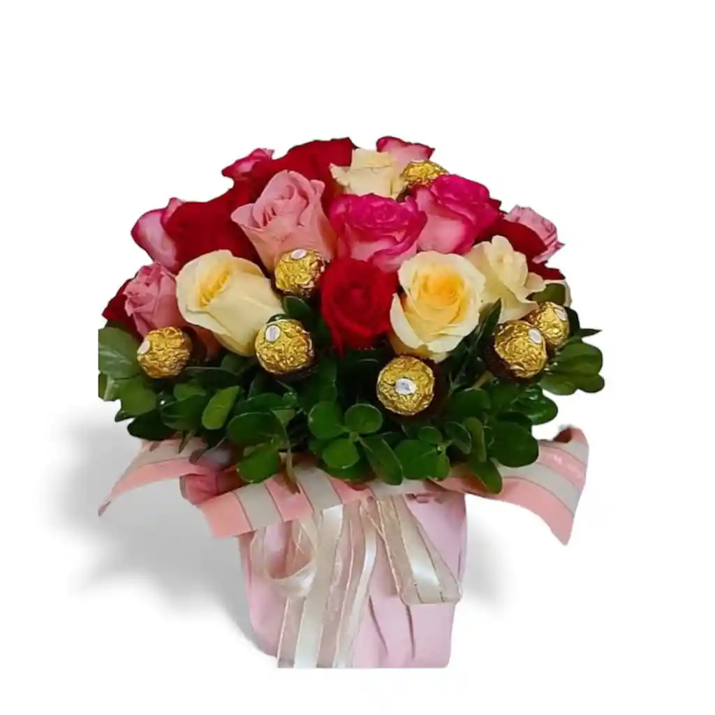 Hermoso ramillete de mesa adornado de rosas surtidas follaje verde . Incluye 7 chocolates ferreros y lazo cinta