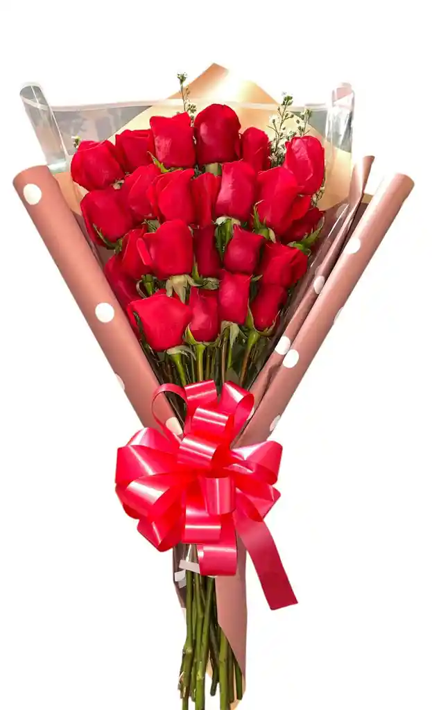 Ramillete elegante compuesto por 24 rosas frescas acompañadas de follaje natural, envuelto en sofisticado papel coreano y terminado con un delicado lazo. Un detalle clásico y romántico ideal para aniversarios, cumpleaños o declaraciones de amor inolvidables.