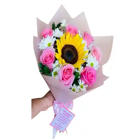 RAMO DE GIRASOL GRANDE, ROSAS ALREDEDOR, FOLLAJE, DECORADO EN PAPEL COREANO, LAZO EN CINTA