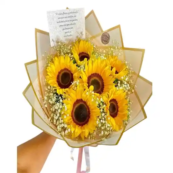 RAMO DE GIRASOLES GRANDES, FOLLAJE, DECORADO EN PAPEL COREANO, LAZO EN CINTA
