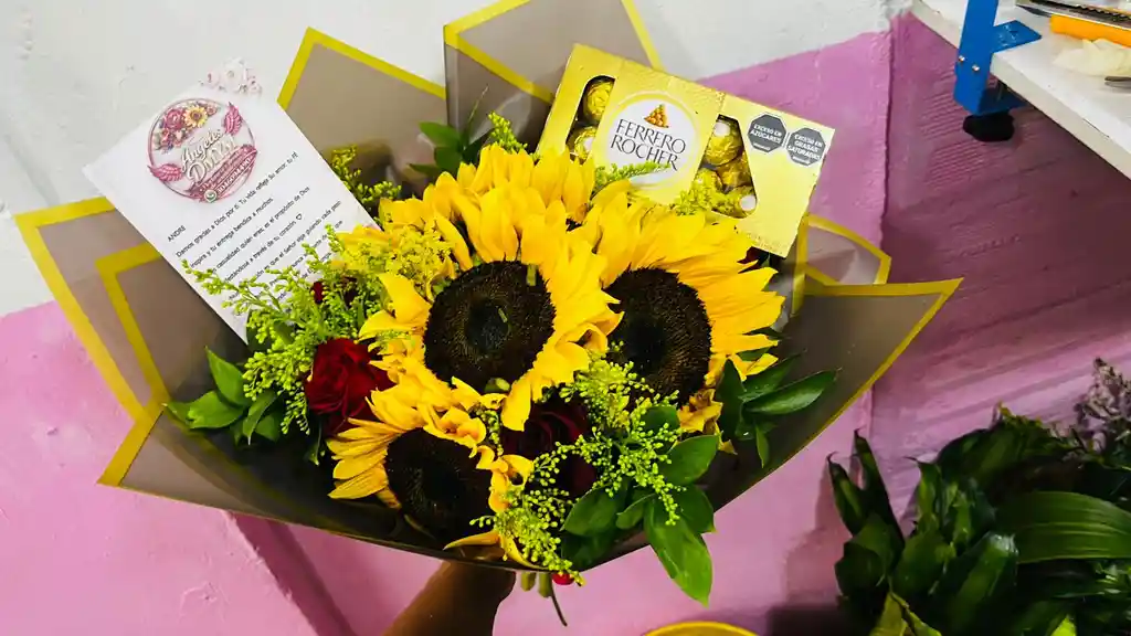 Ramillete de mano en Rosas rojas y Girasoles acompañado de caja de ferrero rocher por 8.