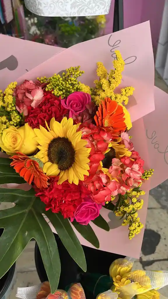 RAMILLETE DE FLORES SURTIDAS ENVUELTO EN PAPEL KOREANO , MOÑO Y MENSAJE